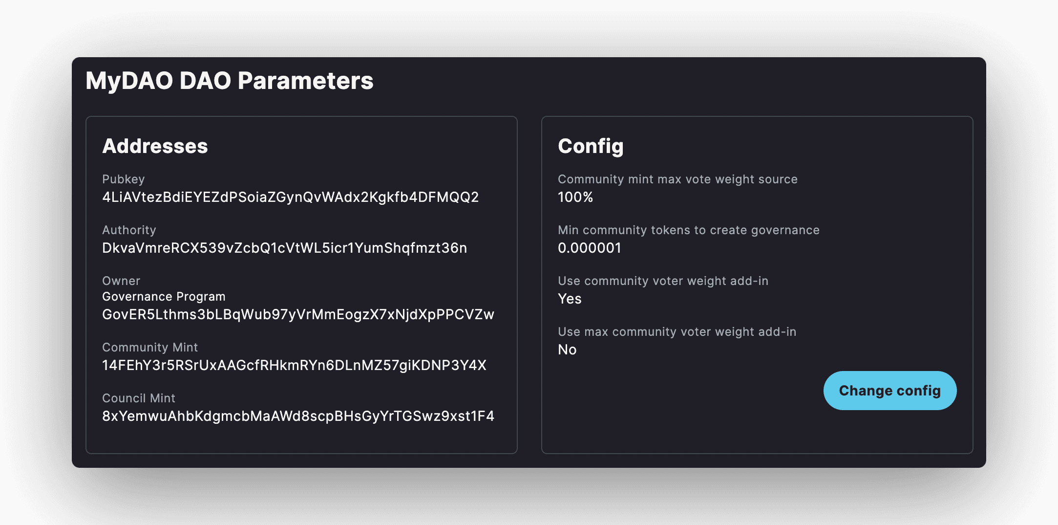 If you want DAO community members to be able to create proposals, as well as vote on them, while still on the DAO parameters page, select 'Change Config' on the Governances section, and check the "Enabled" toggle beneath "Min community tokens to create proposal".