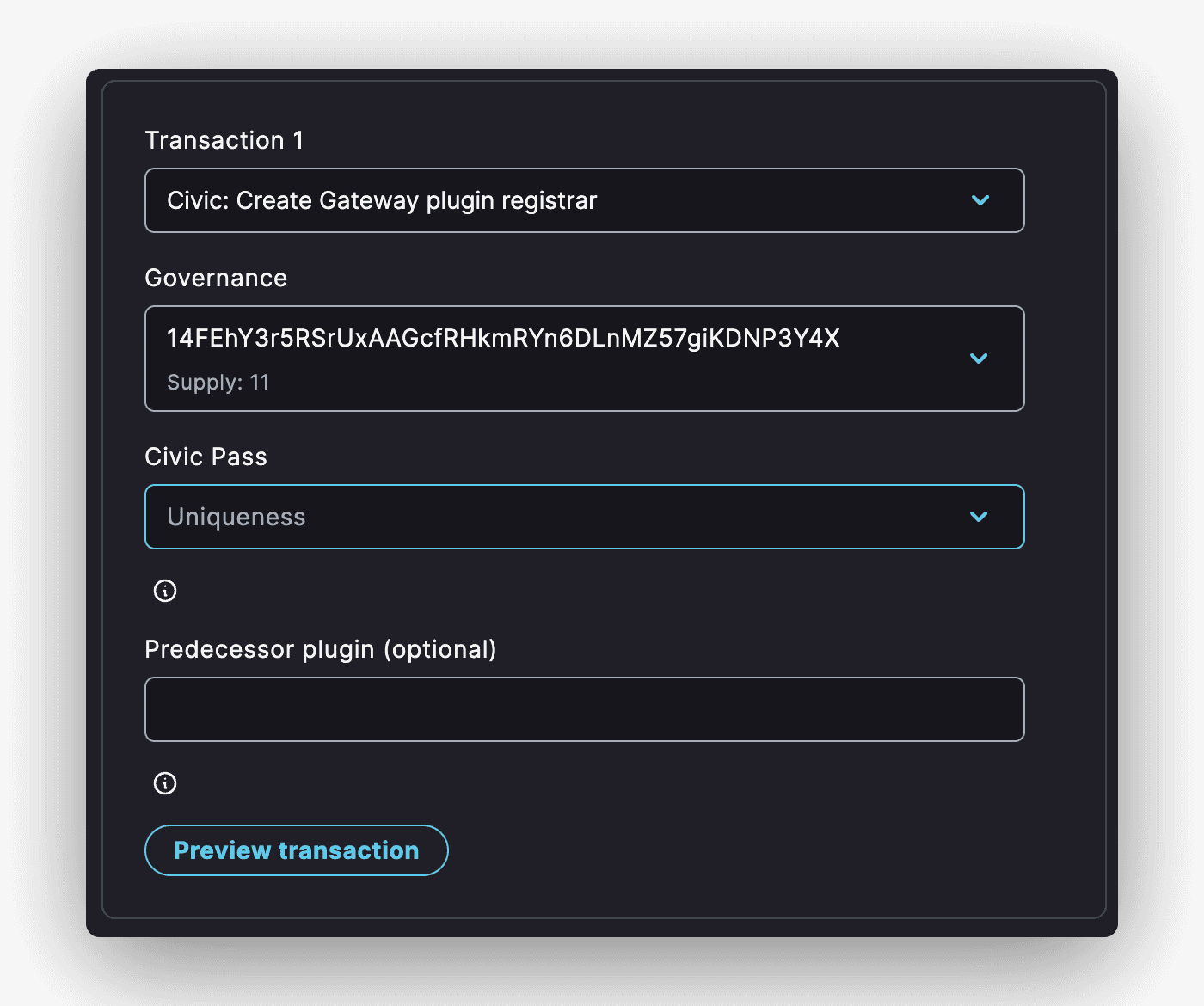 The Civic (opens in a new tab) Pass plugin allows a DAO to connect their DAO to Civic (opens in a new tab) Pass, a platform using the decentralized Gateway Protocol to verify and tokenize aspects of their members' real-world identity
