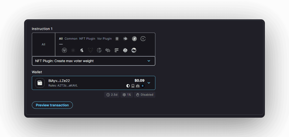 The NFT collection configuration instruction must be added for every NFT collection which should be allowed to participate in governance of the DAO. Each NFT collection has the following parameters: