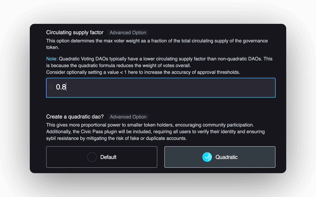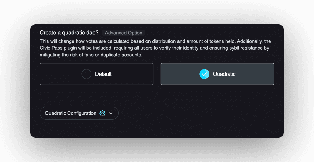 This means that Quadratic Voting DAOs in Realms require voters to have a Civic Pass. For more details, see civic.com (opens in a new tab).