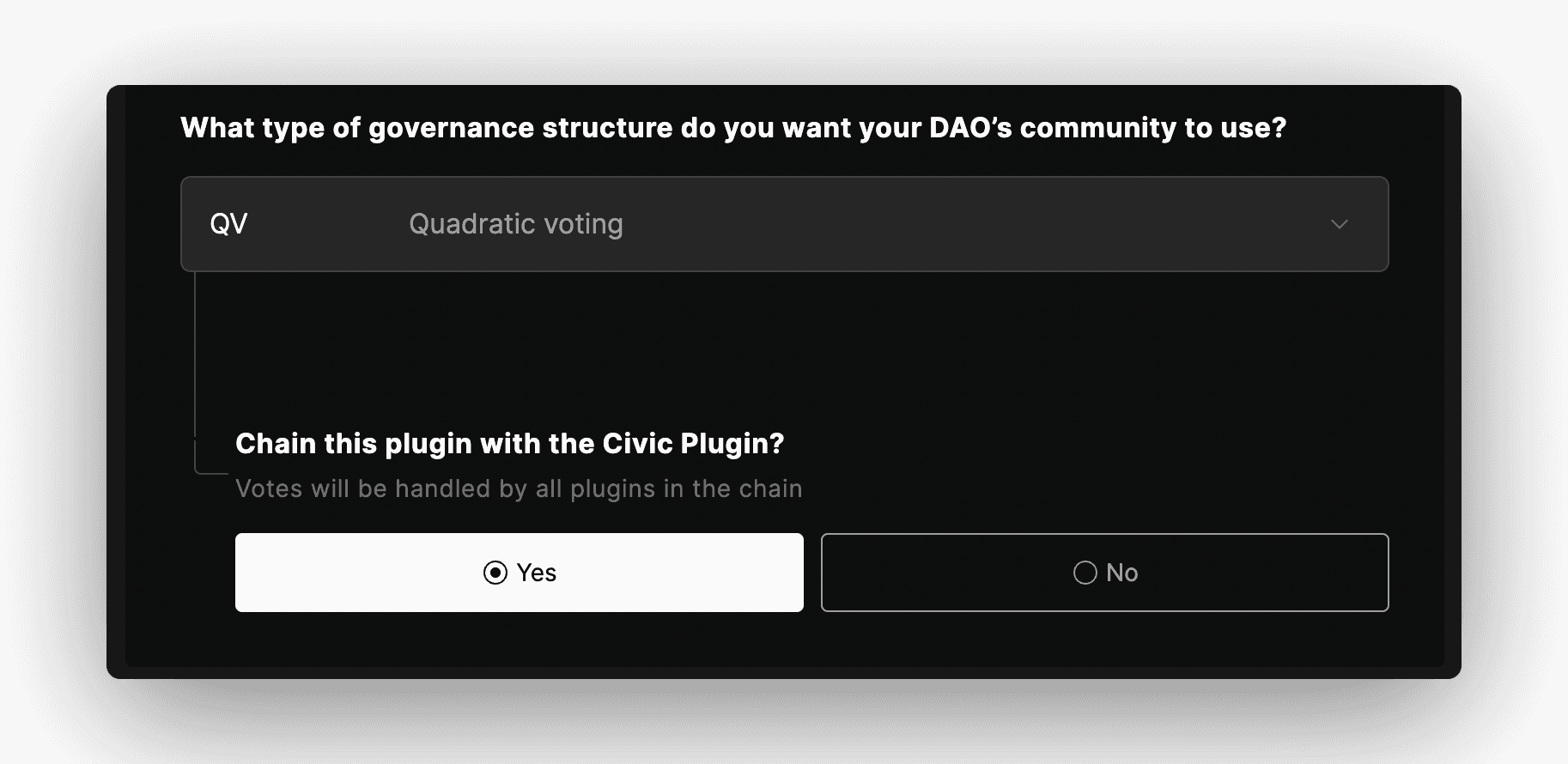 This time, select Quadratic as the governance structure, and enable the Chain this plugin with the Civic Plugin? option.