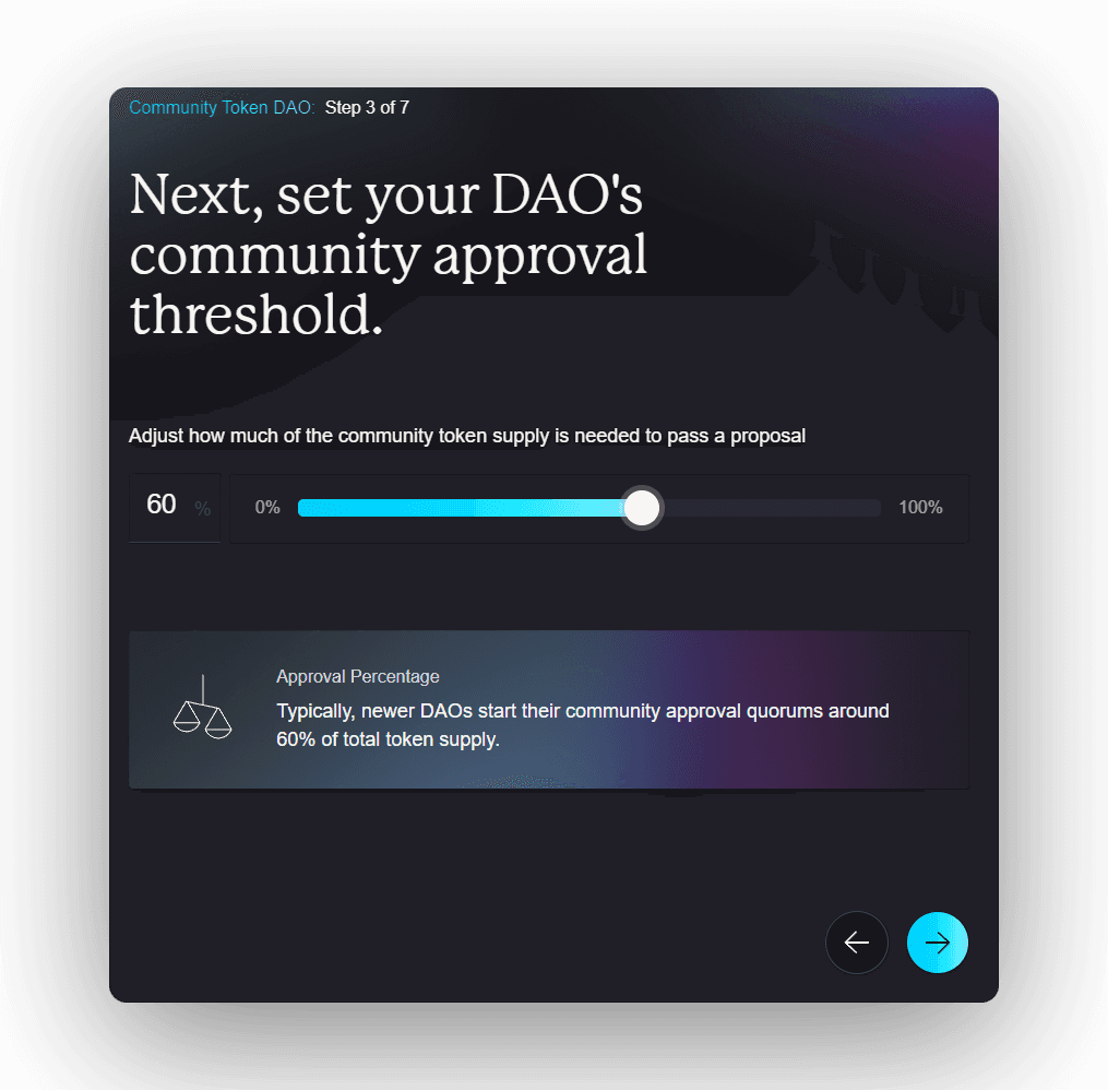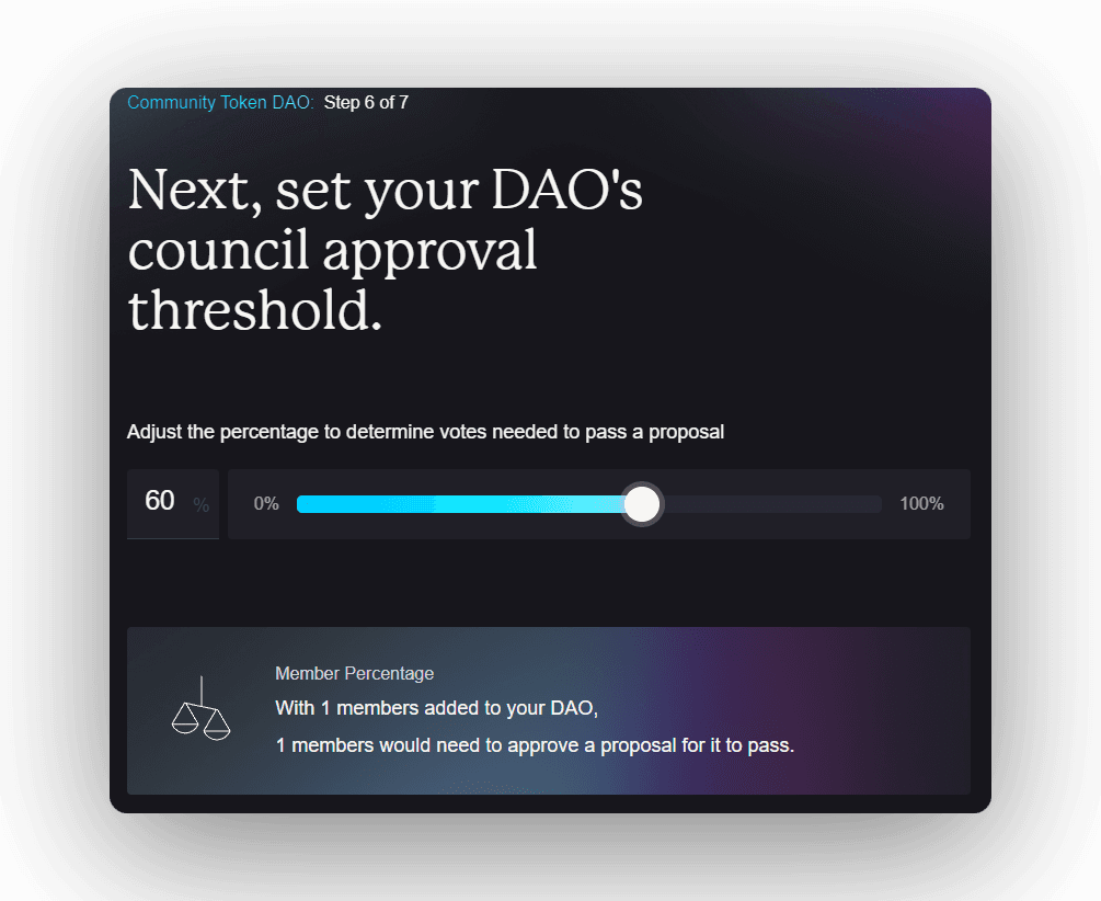 In the next step, you are going to set the approval threshold. The approval threshold refers to the minimum percentage of votes required for a proposal or decision to be approved. The default is 60%.