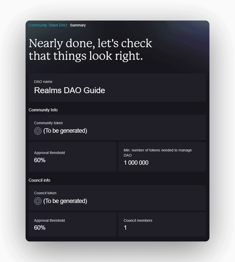 After creating the DAO make sure to create a test proposal to see if the DAO is running on the correct parameters and to see if proposals can go through the quorum.