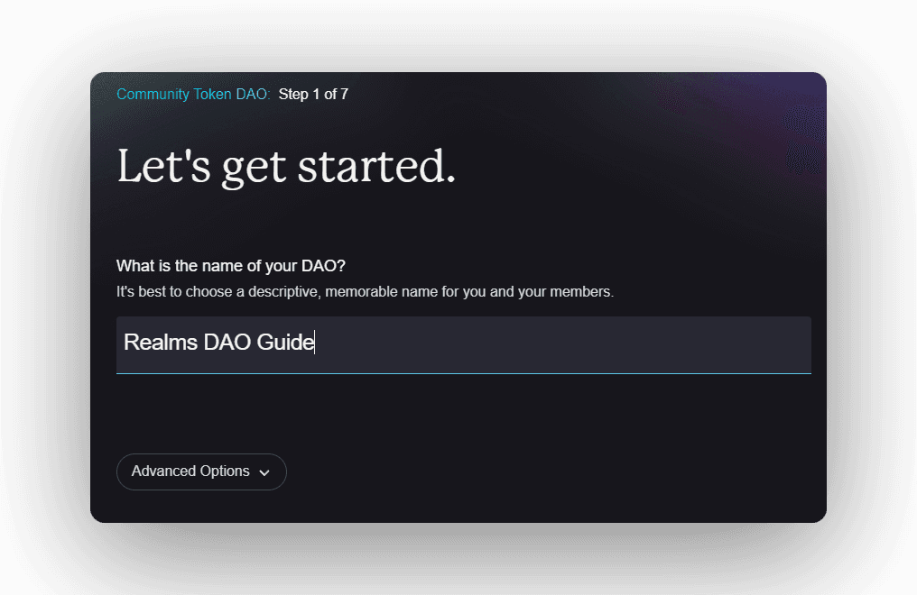 Realms will provide a governance program ID by default, users can add their own customer Program ID under Advanced Options at this step in the community token DAO wizard.
