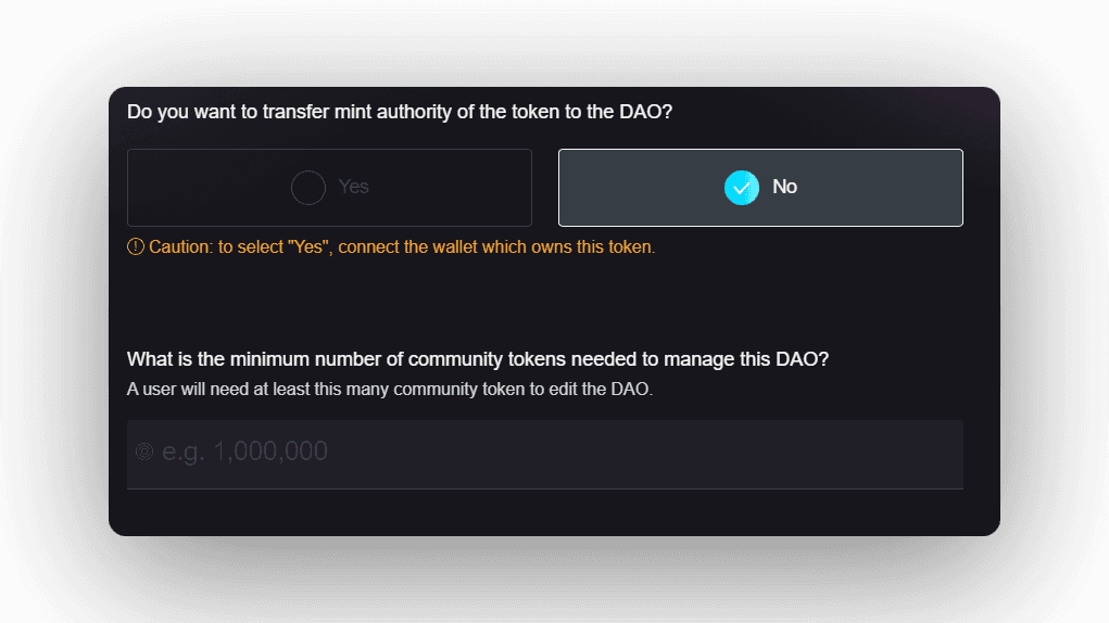 After selecting "No" you will be prompt to define the minimum number of community tokens needed to manage the DAO.