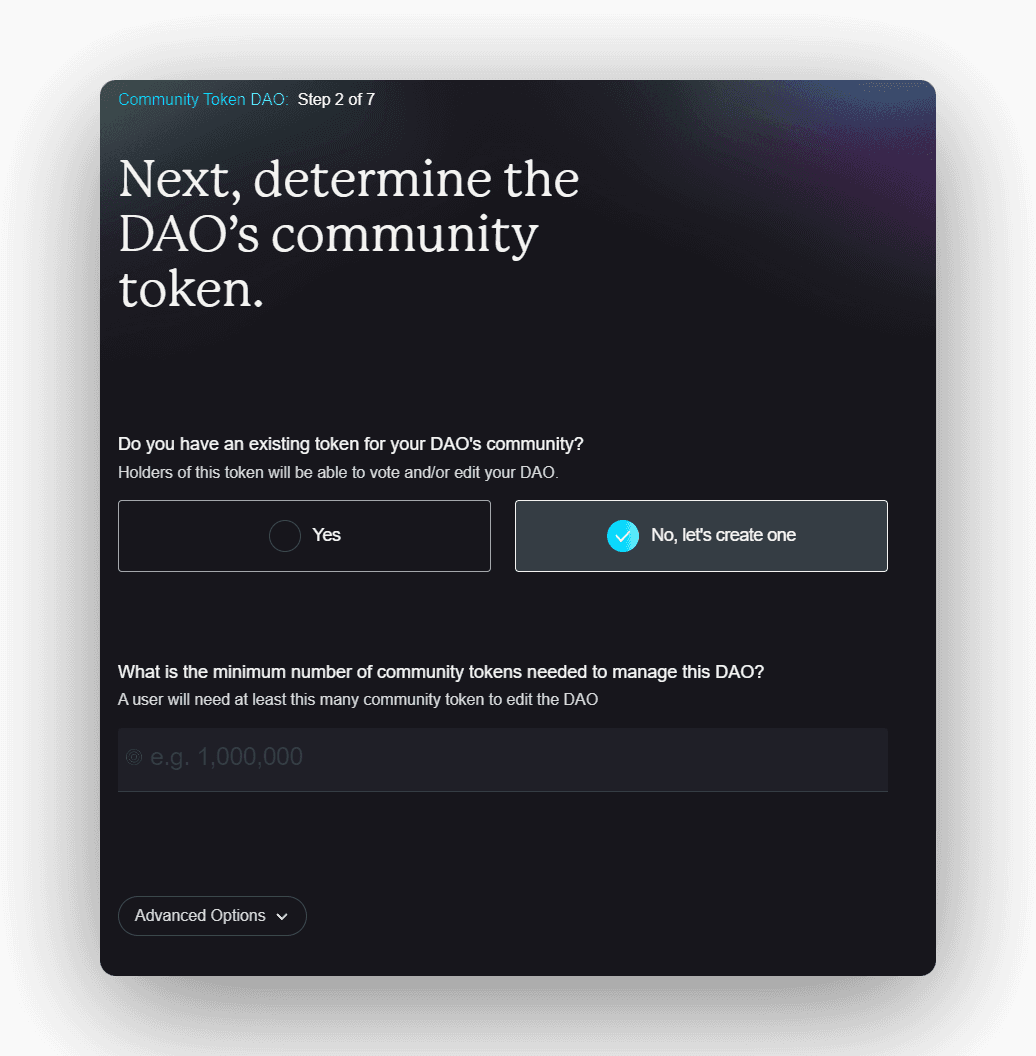 When you choose to create a Community Token DAO, we assume that you're an advanced user who understands all the governance setup details and we present you a more complex and flexible form than the multisig DAO.
