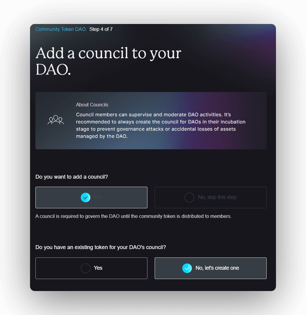 It’s recommended to always create the council for DAOs in their incubation stage to prevent governance attacks or accidental losses of assets managed by the DAO.