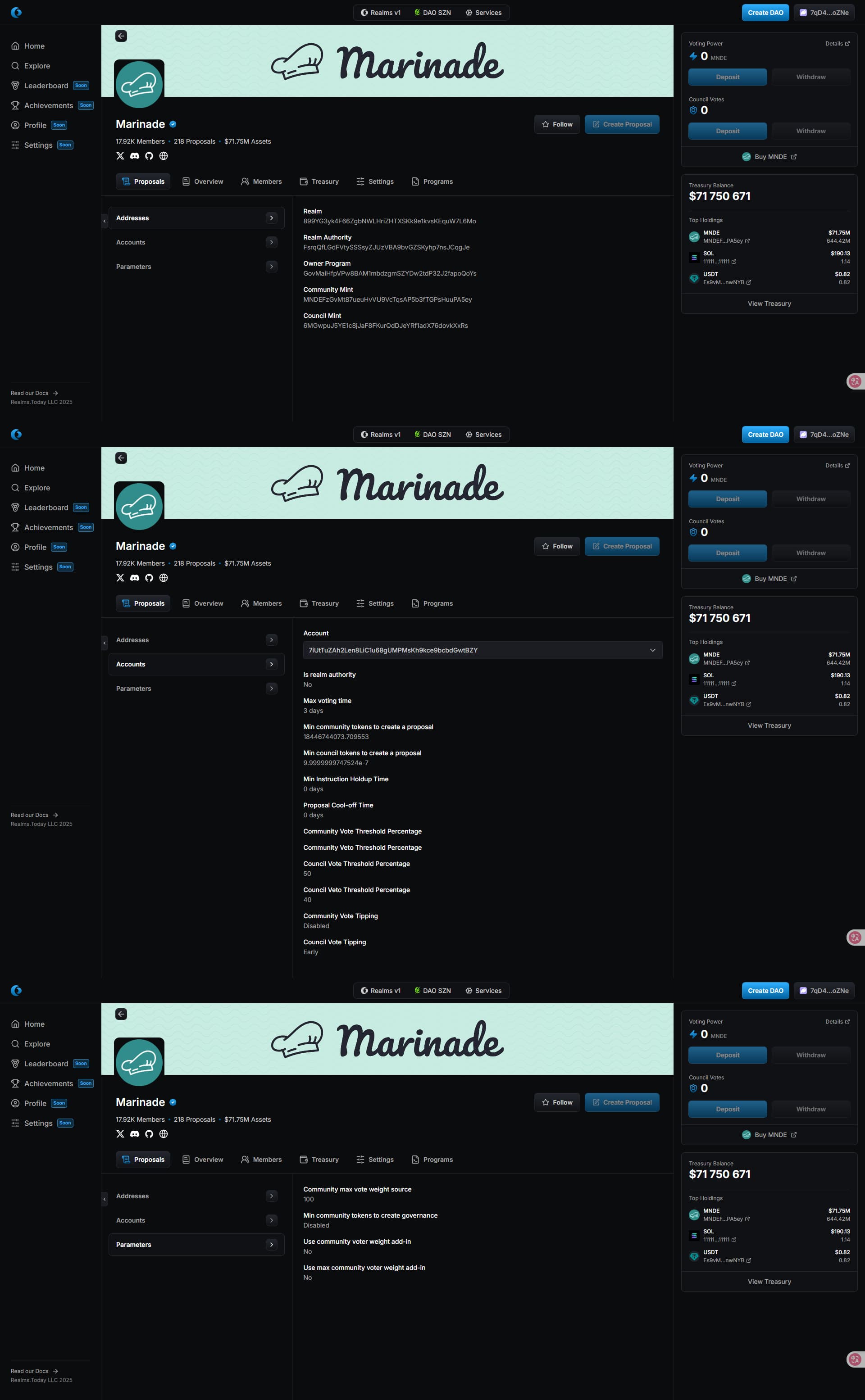 The Rules tab provides a way to change Governance parameters (similar to the Params subpage), and the Treasury and NFTs tabs provide information about the assets. (Legacy Only)