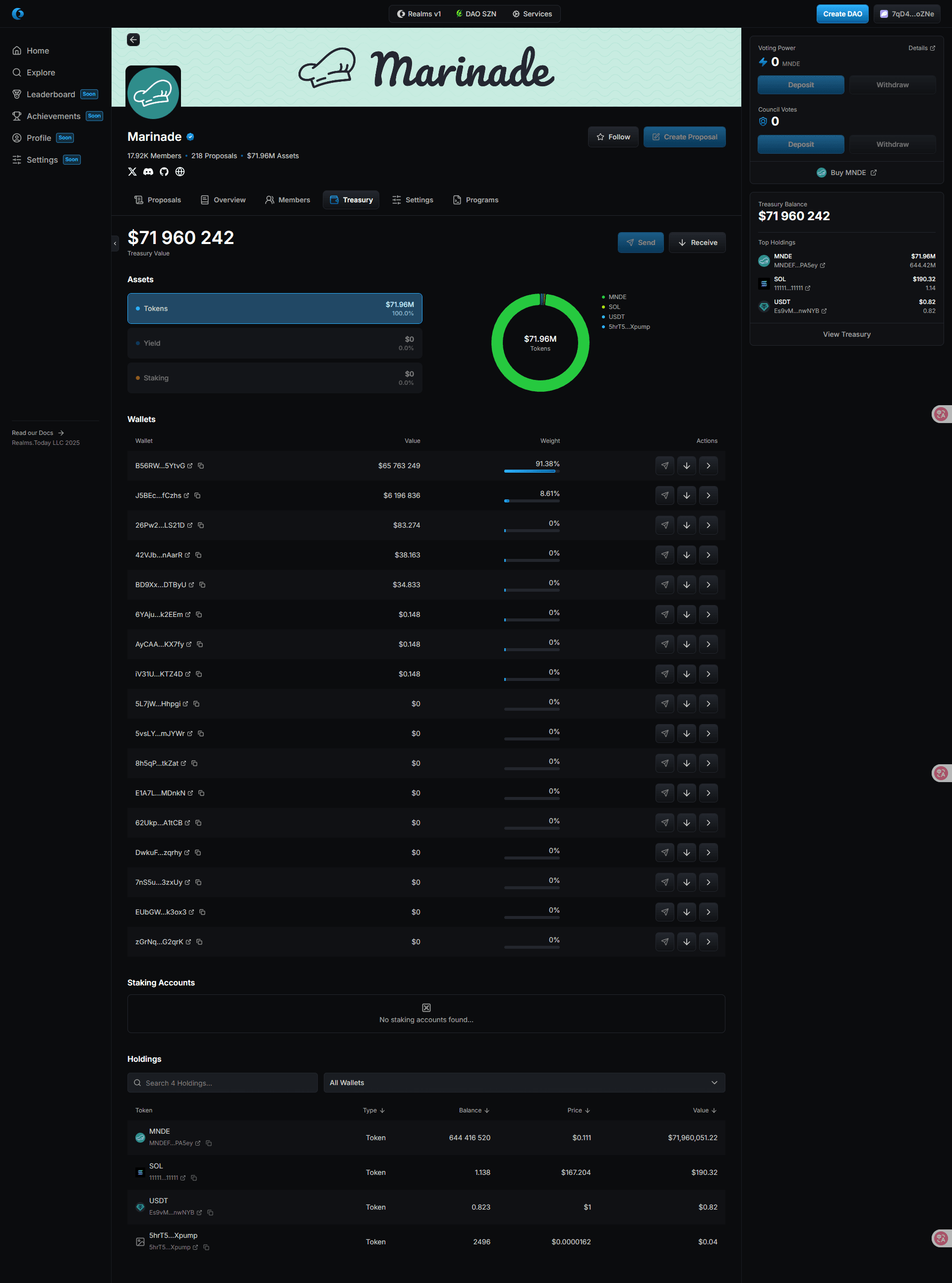 The Accounts tab lists the native treasury wallet, ATA token wallets managed by the governance, and program accounts or a mint, if available.